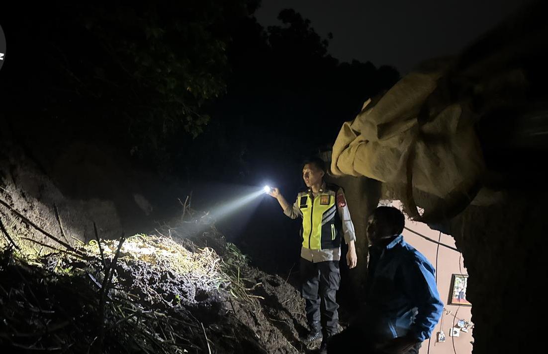 LONGSOR AKIBAT HUJAN DERAS DINDING RUMAH WARGA JEBOL, POLISI LAKUKAN CEK LOKASI BENCANA.