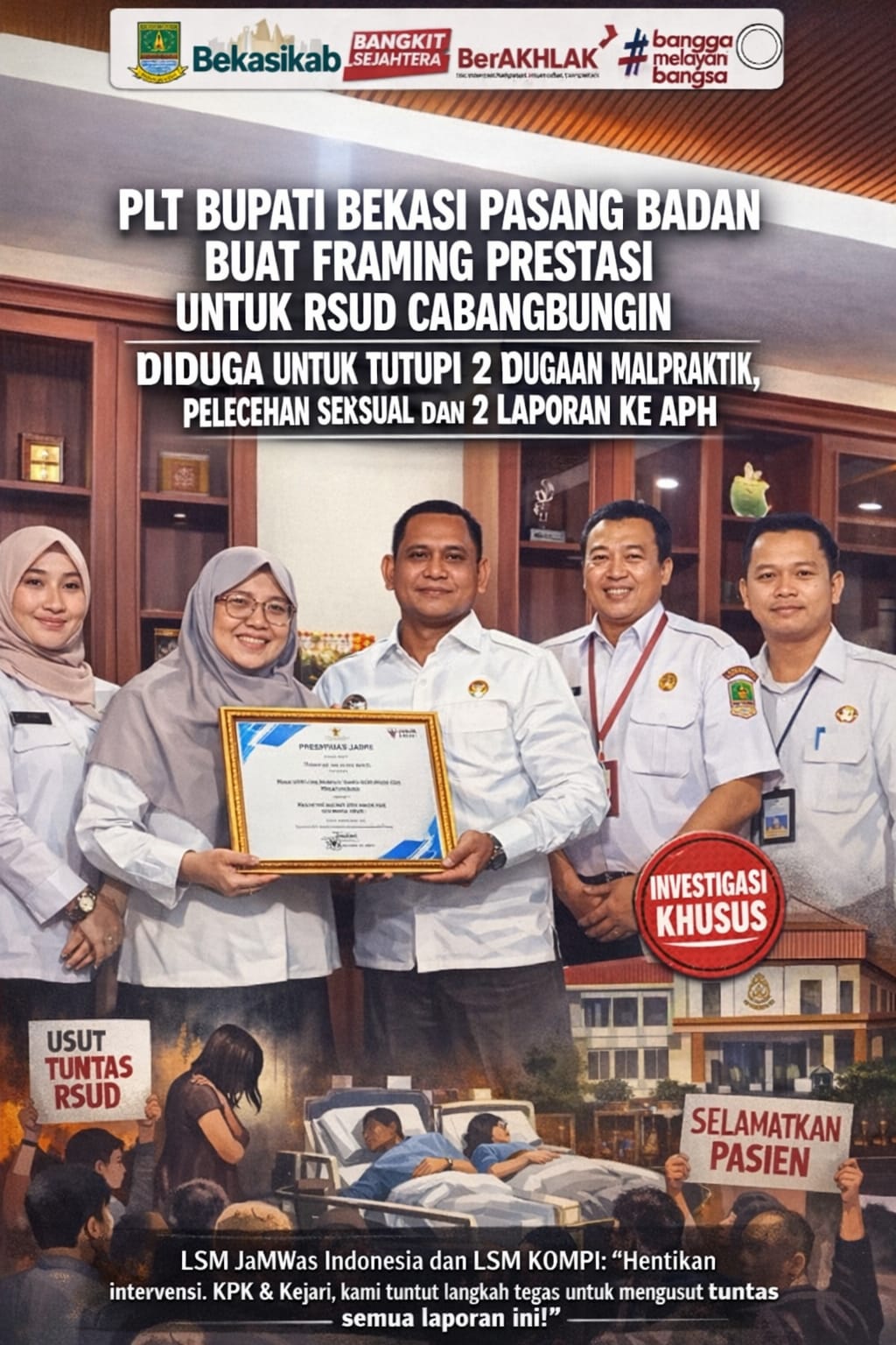 Bekasi,TRIBUNPRIBUMI.com – Di saat publik menuntut keadilan, transparansi, dan penegakan hukum, Pemerintah Kabupaten Bekasi justru memilih jalan berbeda dengan cara memoles citra RSUD Cabangbungin melalui framing prestasi. Langkah ini menuai kritik tajam karena dilakukan bersamaan dengan mencuatnya dua dugaan malpraktik medis, dugaan pelecehan seksual oleh tenaga kesehatan, serta dua laporan resmi ke Aparat Penegak Hukum (APH), yakni Komisi Pemberantasan Korupsi (KPK) dan Kejaksaan Negeri Kabupaten Bekasi.