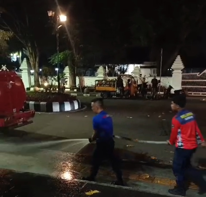 Sejak tadi malam,ada puluhan personel Disdamkar tampak dikerahkan untuk membersihkan berbagai area strategis di sekitar Pendopo. Mulai dari halaman utama, jalur akses masuk dan keluar, hingga titik-titik yang diperkirakan akan dipadati jamaah, tak luput dari perhatian. Kegiatan ini dilakukan secara menyeluruh dengan menggunakan peralatan kebersihan manual maupun dukungan armada milik Disdamkar.